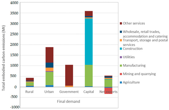 The production of carbon emissions is not driven solely by the consumption of residents in China. In addition to current consumption, emissions are also embodied in exports for foreign consumers, plus emissions are embodied in purchases for common goods (government consumption), and in goods and services flowing into fixed capital formation. These categories of final demand (including rural residential consumption, urban residential consumption, government consumption, fixed capital formation, and net exports) are disaggregated in Figure 3. We can see that carbon emissions embodied in goods and services flowing into fixed capital formations are the main source of China’s total embodied carbon emissions, and next is urban residential consumption. Within fixed capital formation, construction and manufacturing almost contribute 90% of the emissions.