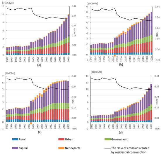 Figure 4 also indicates that emissions from fixed capital formation and residential consumption (especially urban residential consumption) are the main sources of carbon emissions in China and they are increasing. An additional line has been drawn in each figure to show the ratio of emissions caused by residential consumption in total national emissions and we can see it is in a downward trend but has remained above 30% over time.