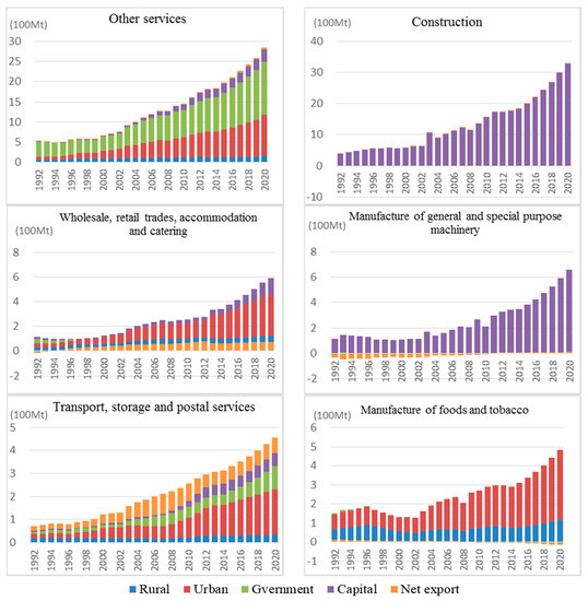 Secondly, this paper determines which industries produce the largest carbon emissions and by which type of final demand these emissions are caused. In Figure 5, we chose six industries with higher emissions in 29 industries to show their total embodied carbon emissions from 1992 to 2020 by the type of final demand, respectively. These six industries are other services, construction, wholesale, retail trade, accommodation and catering, industrial machinery and equipment, transport, storage, and postal services, and foods and tobacco.