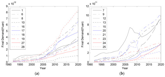 Final demand of 20 industries in 1992–2020. Note: the numbers in the legends are industry numbers.