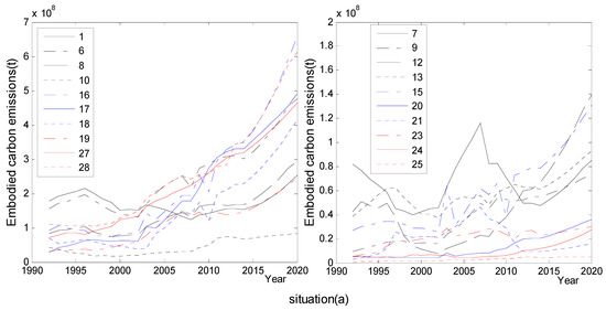 - measure the 29 industries’ embodied carbon emission multipliers and total embodied carbon emissions of 29 sectors from 1992 to 2020 with Equation (3).