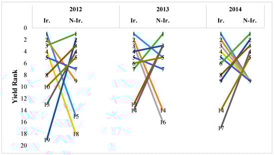 Spearman’s rank yield correlation irrigated vs non-irrigation treatments. The yield change in rank between Ir: irrigation (irrigated treatment) and N-Ir: non-irrigation (non-irrigated treatment) of proso millet varieties. The top five ranking varieties for yield in both irrigated and non-irrigated treatments were compared at each year. RS: Spearman’s rank correlation. Varieties are ranked from 1 = highest yield to 20 = lowest yield. RS = 0.18 (2012), RS = 0.40 (2013), and r = 0.29 (2014). Spearman’s rank correlation coefficient, tested (p < 0.05).