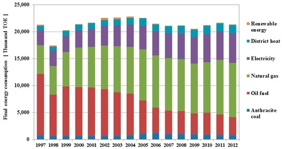 Figure 1 illustrates the final energy consumption in residential building sector. As for the final energy consumption by sector, the energy consumption of the residential building sector was 21.2 Mtoe in 2010, accounting for 10.8% of total national energy consumption and 56.9% of the energy consumed in the building sector, which is a very high proportion [22]. Residential buildings consumed 21.3 Mtoe of final energy in 2012 because use of natural gas continued to increase for space heating, water heating and cooking. In 2012, natural gas accounted for roughly 48% of total residential building final energy consumption (Figure 1). The penetration of electricity is still 25% of total energy used by residential buildings. Electricity is widely used for lighting and for powering household appliances. Oil fuel has been used for space heating in the form of kerosene and for cooking in the form of liquefied petroleum gas (LPG). Oil has decreased to an annual average growth rate of about –7.2%. Because of the penetration of district heat system in urban areas, district heat energy consumption represented 7.3% of the total energy used by the residential building sector. The use of oil is not common but is still used in the Korean buildings, mostly for space heating, water heating and cooking. Space heating, water heating and space cooling roughly accounted for 70% of residential energy consumption.