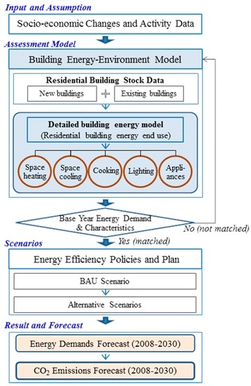 The structure and framework of the assessment model is presented in Figure 2. This building energy–environment model consists of four parts: input and assumption, assessment model, scenarios and result and forecast. The result and forecast part shows the annual output projection of energy consumption and CO2 emissions according to the BAU scenario and alternative scenarios. The data from socio-economic assumptions and the number of residential buildings are used as inputs for the building energy–environment model to create the residential building stock data and detailed building energy model (profile of residential building’s energy end-use). The residential building stock data consisted of new building data after base year (from 2008) and existing building data before the base year (by 2007). The detailed building energy model is comprised of five sectors: space heating, space cooling, cooking, lighting and appliances.