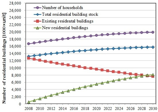 The main key issue is the representation of the expansion of residential building stock data for the number of residential buildings used in this model. We collected historical statistics about residential buildings, such as yearly numbers of residential buildings and new constructions between 1985 and 2010. After 2010, the forecast of number of households and the assumed population growth were used to calculate the total number of residential buildings to 2030. Particularly, residential building growth is strongly linked to household growth in Figure 3. We assumed that the lifespan of a residential building to be 40 years after construction and apply the demolition rate of 2.3% from the construction statistics [21,23]. The demolition rate means that 2.3% of the remaining building stock in any given year retires in the following year. A total residential building stock consists of new residential buildings and existing residential buildings (Figure 3). The number of existing residential buildings will decrease from 12,105,000 houses in 2010 to 7,601,000 houses in 2030. On the other hand, the number of new residential buildings will increase from 1,498,000 houses in 2010 to 8,159,000 houses in 2030, because the new residential building is the cumulative value of the number of residential building built after the base year.