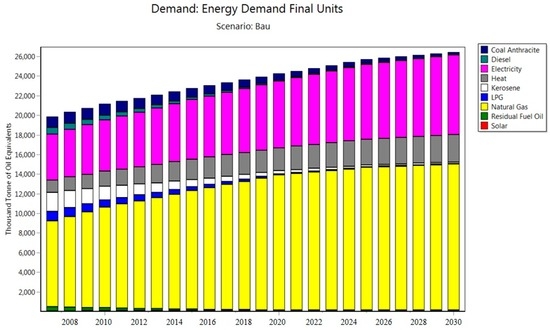 Assessment results of the BAU scenario are shown in Table 3 and Figure 4. Total final energy consumption in residential buildings in 2007 is reported at 19.88 Mtoe. This shows a 5.6% error compared to 21.07 Mtoe, which was the final energy consumption in 2007 reported by Korea Energy Statistics [22]. The energy output of the BAU scenario in 2010 was 21.19 Mtoe, whereas the final energy output from Korea Energy Statistics was 21.18 Mtoe. Results of the BAU scenario during the period 2007–2010 are quite similar to the figures presented by Korea Energy Statistics [22]. The increase in the amount of energy expected to be consumed in 2030 was over 33% in the BAU scenario. On the basis of the final energy consumption in 2007 from Table 3, space heating accounted for about 67.5%, which is the largest proportion of energy consumption in residential buildings. Space heating accounts for most of the energy consumption and is a key factor in CO2 emissions of residential buildings. Space heating energy consumption is expected to increase 16.0% in 2030 compared to 2010. It was found that the energy consumption from home electrical appliances accounted for 17.5% of the total energy consumption in 2010. This rate is seen to increase by 4.8% from 2010 to 2030. In the BAU scenario, energy consumption continuously increased by 124.8% during the period 2010–2030. Figure 4 gives the demands of the energy source in the BAU scenario for the period 2007–2030. In 2030, the maximum energy consumption is expected to be come from natural gas (57.2%), electricity (31.0%) and district heat (10.3%). Natural gas and district heat are used for space heating in South Korea’s residential buildings. Natural gas increases by 148.6% from 2010 to 2030. Electricity is mostly used to operate home electrical appliances and lighting in households. Electricity consumption will rise by 179% by the year 2030. The energy consumption output of the BAU scenario was projected using the conventional trends (population, household and efficiency), the energy use patterns of residential buildings, the economic situation and the energy policy.