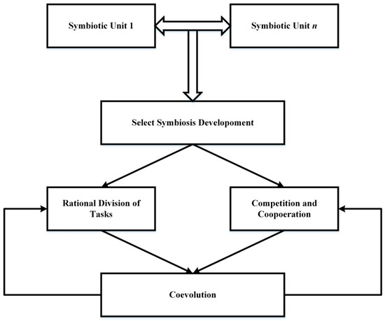 Since the mid-20th century, symbiosis theory has been applied in social science. The application of symbiosis theory in management was initiated in the study of industrial clusters. During the development of RI, the emergence and evolution of RI clusters are similar to that of the industrial clusters. The formation of an RI cluster starts from the selection of a symbiosis development mode. Organizations exist in the cluster as symbiosis units and they cooperate and compete with each other through rational division of different tasks to achieve a synergy effect and co-evolution. This symbiotic evolution process of a cluster can be summarized and demonstrated as per Figure 1. Following this analysis framework, the symbiosis system of an RI cluster will be studied.