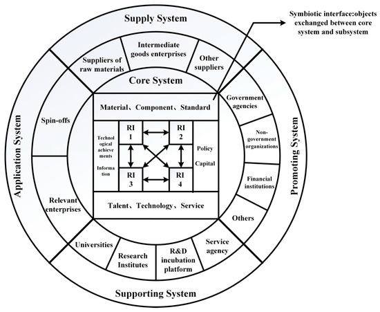 In an RI cluster, the exchange objects between core system and each subsystem include materials, components, “intermediates”, standards, policy, capital, talent, technology, service, technology, information and so on. They form an interaction interface in the exchange process. Through the interface, symbiotic units in the system follow the interdependent organizational principle aiming at the maximum benefits of the whole symbiosis system. The most important thing for an RI cluster is not each symbiotic unit, but the cooperation relations between individuals. The various systems in Figure 2 have a dialectical relationship of competition and cooperation, being independent from each other and interdependent upon each other. Although cooperation is the first significant feature of this symbiosis system in Figure 2, the competition also exists in the system objectively. However, the competition is not a substitution, rejection of symbiotic units for each other, or disappearance of the characteristics of symbiotic units, but a supplement to and promoting force for symbiotic units, and an inheritance of its own characteristics. This is also the focus of the next section.