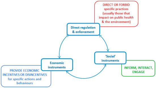The three categories of policy instruments adopted here are presented in Figure 1 below. It is worth noting that Bemelmans-Videc et al. [24] also group policy instruments into three equivalent categories, namely ‘sticks’ (for direct regulation), ‘carrots’ (for economic instruments), and ‘sermons’ (representing communication and information-based instruments). Other authors do not explicitly classify policy instruments [25].
