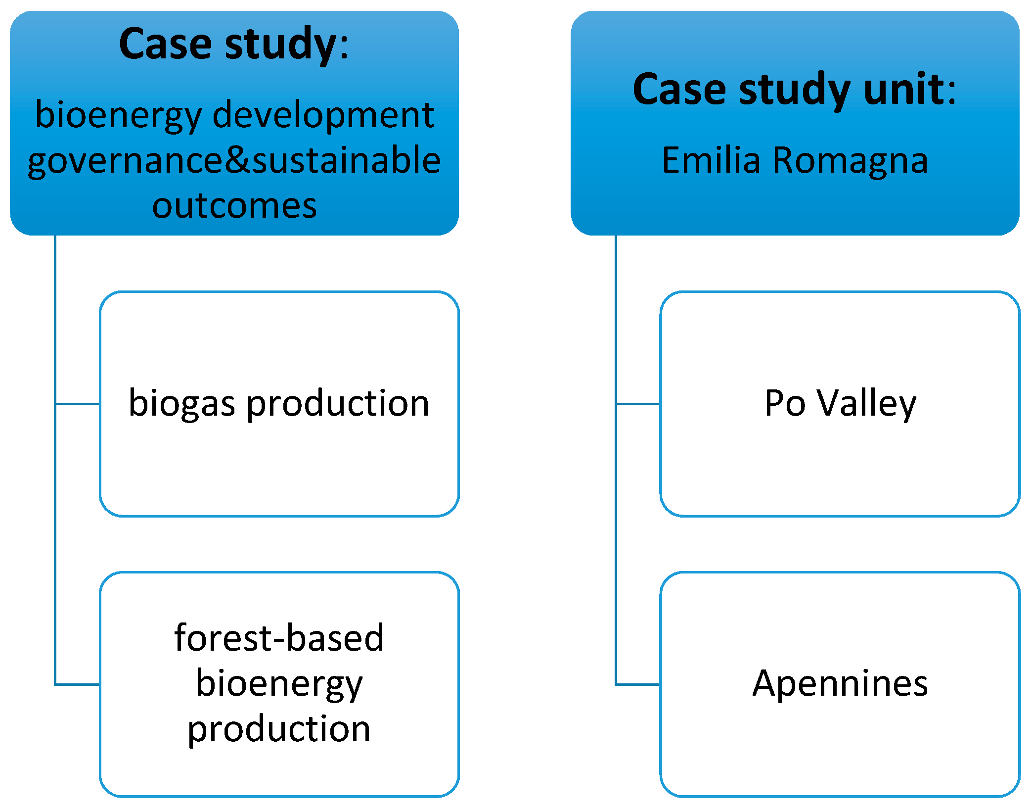 This study employs qualitative case study methodology [51,52,53,54,55,56,57] which is typically used to explore and unravel a complex or little-known phenomenon within its real-life context [54,55]. Accordingly, this case study design aims to explore the phenomenon of local governance of bioenergy development in Emilia Romagna and its capacity to deliver sustainable outcomes. The case study design is thus structured as follow. The case study is that of bioenergy development governance in Emilia Romagna, which is the geographical case study unit [54]. Both the case study and the case study unit splits into sub-categories, i.e., the case of bioenergy development governance is distinguished in biogas and forest-based bioenergy production, while the case study unit includes two geographical areas within the region, namely the Po Valley and the Apennines (sub-units) (see Figure 1). The study adopts a comparative case study design to explore the differences in the governance of bioenergy development in the two sub-case studies and understand the reasons behind different triple bottom line outcomes in the two regional sub-units (Figure 2).