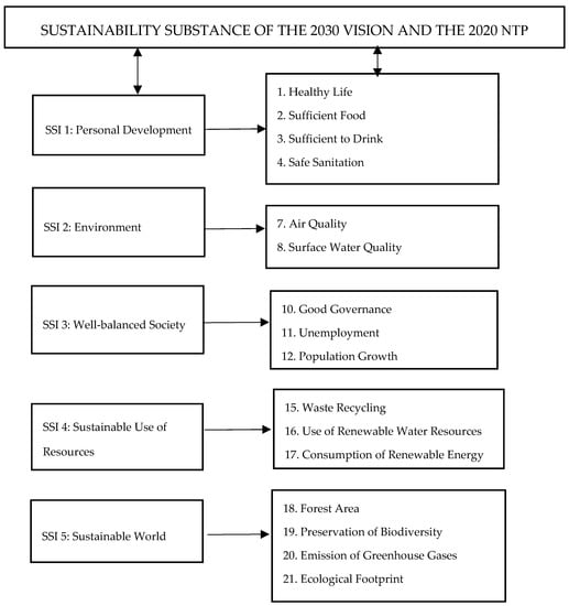 The assessment of the sustainability substance of the Vision 2030 is done through the lenses of environmental, social and economic sustainability. The Sustainable Society Index (SSI), developed by Van de Kerk and Manuel [10] breaks down the indicators for measuring sustainability into five broad categories of personal development, clean environment, well-balanced society, sustainable use of resources and sustainable world with a total of 22 sub-measures. The rationale for each specific measure of sustainability is presented in Table 1. These sustainable society indicators (see Figure 1) are employed to measure the sustainability substance of the 2030 Vision and the 2020 NTP.