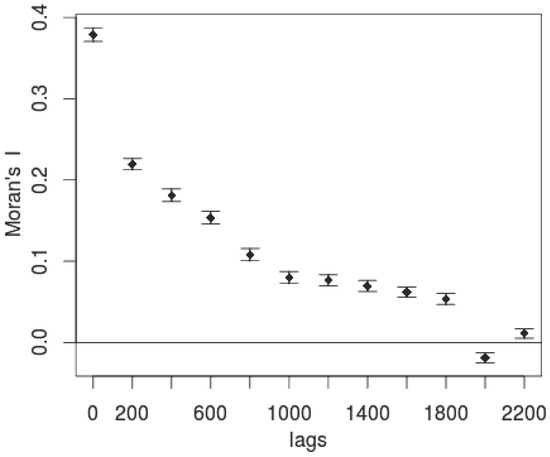 For each of 12 distance bins (between 0 and 2200 km, in increments of approximately 180 km), Moran’s I is calculated as follows: