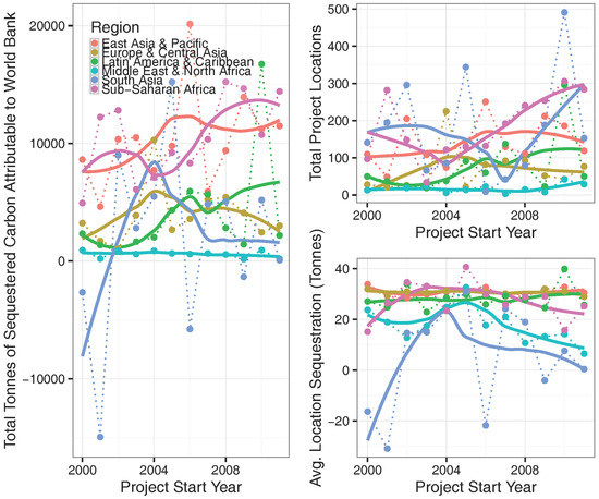 After matching is conducted for each subpopulation, a regression is performed for that subpopulation following Equation (3). This results in 8399 locations which have adequate matches for estimation, or 47% of all large-scale projects’ locations. For each of these models, we record all relevant information regarding standard errors and estimated coefficients. The impacts estimated for each of these locations (θ and the sector-specific interaction term in Equation (3)) are entered into the fixed-effect model derived following Equation (4). This provides a regionally-specific estimate of the tonnes of carbon sequestered attributable to a World Bank project (tonnes/ha). A regional- and temporal-disaggregation of the results across all estimated projects can be seen in Figure 3. Individual estimates for projects—as well as estimated uncertainties—can be found in a dynamic online appendix (see [13]).