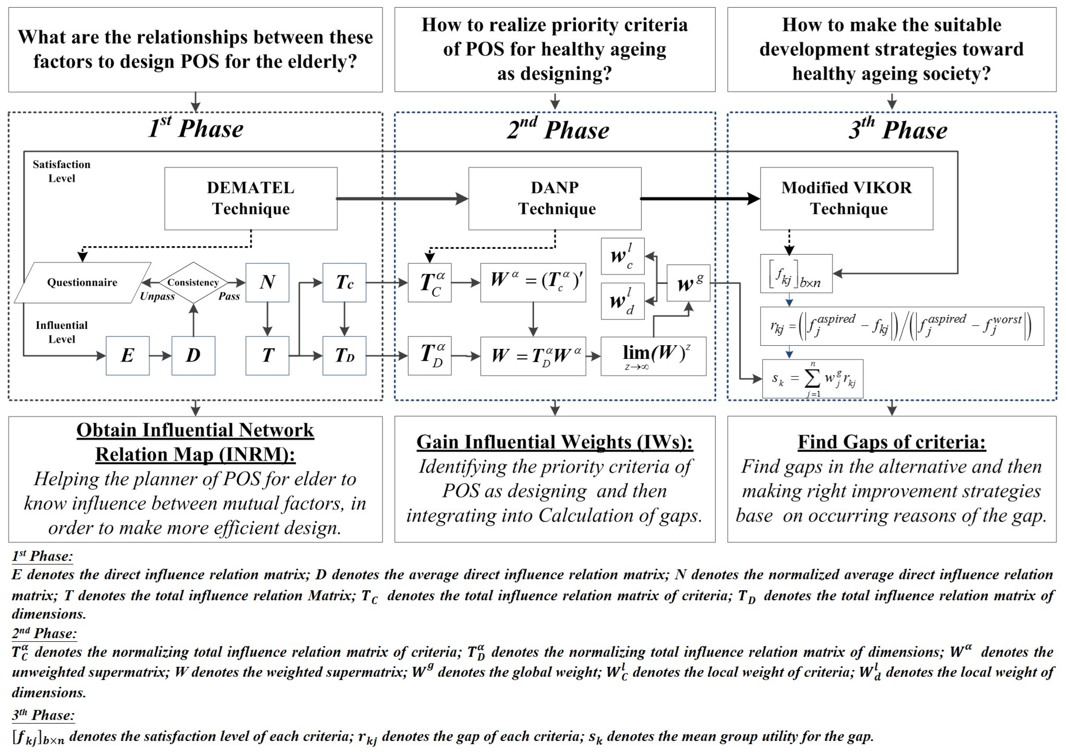 The rest of paper is organized as follows. In Section 2, previous studies (on POS, healthy aging, continuous improvement strategies, and three potential mechanisms) are reviewed to determine the evaluation attributes of POS, and the pretest of indicators, superiority of the DANP-V model, and research procedure are shown. Section 3 describes the empirical case selection and data collection, followed by a discussion. The final section focuses on the crucial findings and discusses future research directions.