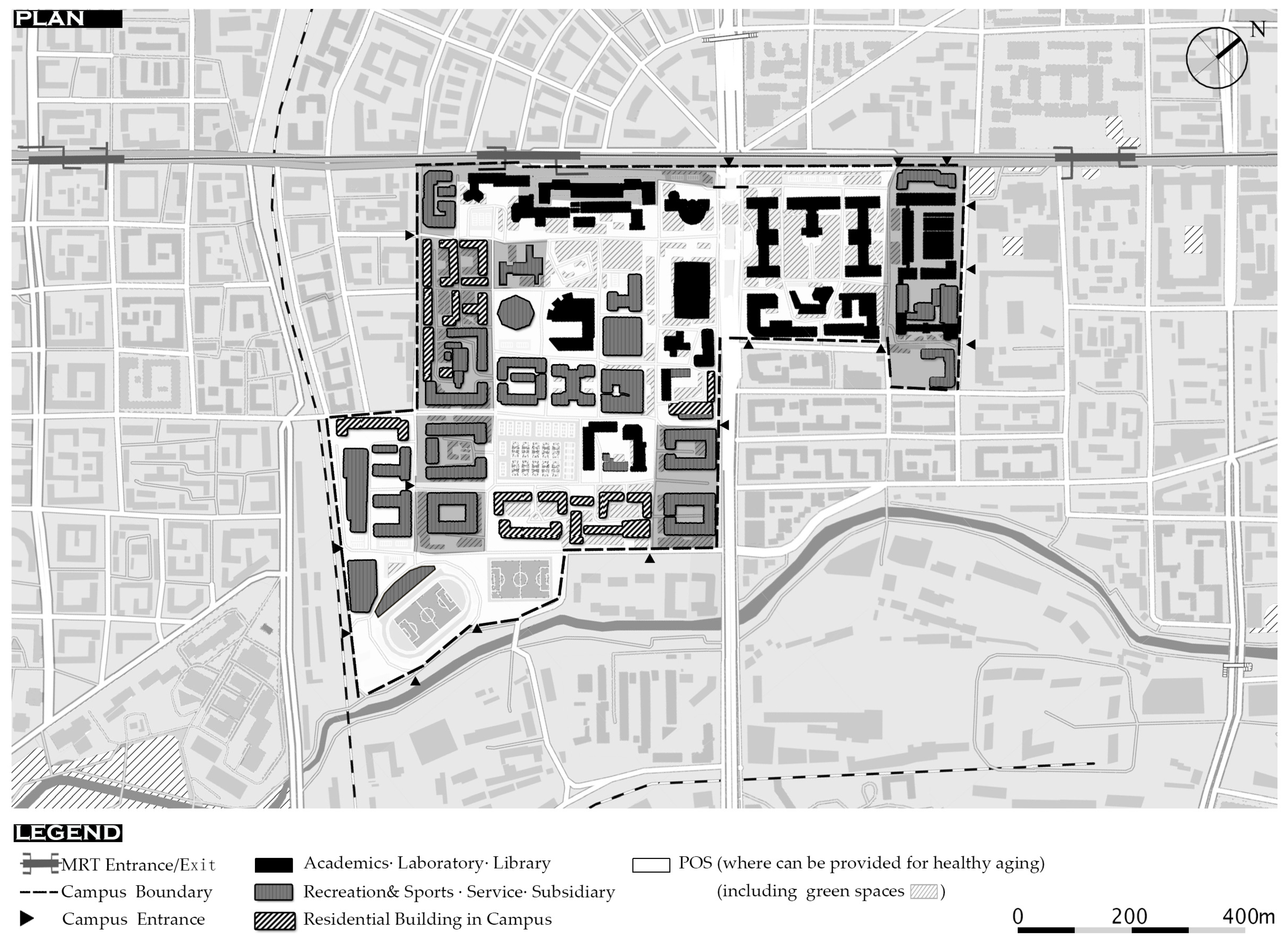 The case selected for this study is an open space in the main campus of the Harbin Institute of Technology (HIT) (Figure 3). The campus is located in the city center with a total area of approximately 66.8 ha, a building area of 1,270,000 square meters, and a floor area ratio of nearly 1.3. According to historical records, several functional areas, such as student and teacher living areas, teaching areas, sports zones, and logistics areas, have been gradually built in the main campus of HIT for different purposes and ages, without following the holistic principles of campus planning. Moreover, no clear boundary restricts access to the main campus, and an urban arterial road has even been constructed across the POS (public open space). This POS serves an educational function, is part of the urban POS system, and is open for public usage because of the POS insufficiency in Harbin city center. The reasons for selecting the open space in the main campus of HIT as a case study are as follows: