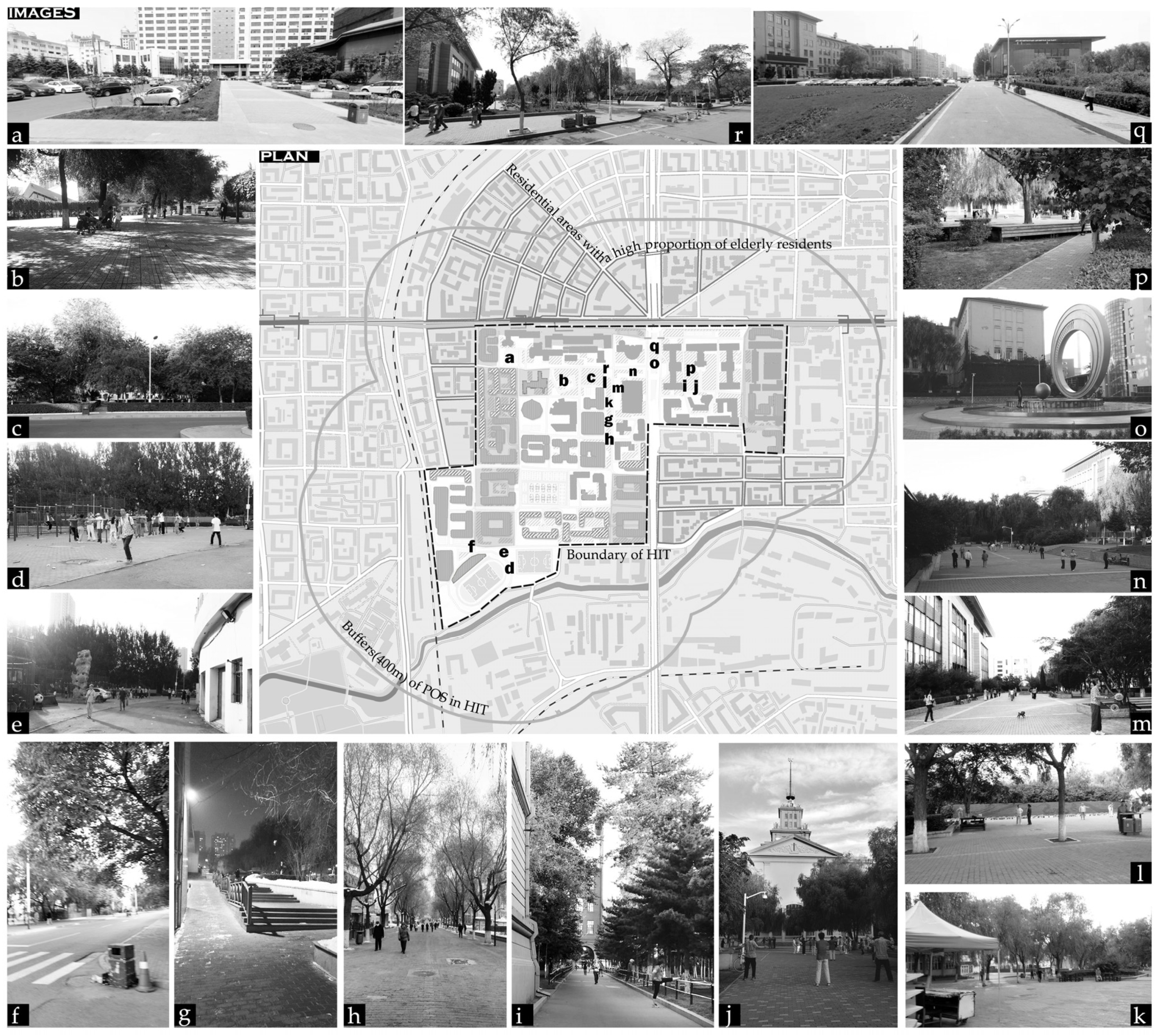The current status of the redevelopment project in the campus is as follows. For the regional boundary, the construction of the front gate has been completed at the entrance to monitor external vehicles and individuals. No large area lawn exists due to the dual effects of restrictive land use and climate. Thus, for the purposed of greening, the larger green area includes three nearly 1-ha green spaces (Vineyard, Alumni Woods, and the backyard of the Hang Tian building; Figure 4b,c,j, respectively), and the remaining small green area consists of trees beside the street and flowerbeds in front of each college (Figure 4h,q, respectively). For the waterscape, the POS initially included an outdoor swimming pool and a fountain, but these features were abandoned because of the difficulty of restoration and maintenance (Figure 4a,b, respectively). The public facilities of HIT are a large supermarket, three small kiosks (Figure 4k), and toilets on the ground floor of various departments including the teaching building and the canteen. The POS has two historic buildings and two monuments or sculptures of cultural significance, including the “Star of HIT” (depicting the minor planet named after HIT; Figure 4o) and a globose sculpture relying on the technology of Seamless Welder (Figure 4m). Other types of construction, such as ramps, sidewalks, and building entrances, have currently achieved the minimum standards of the Codes of Accessibility Design (GB50763-2012; Figure 4g,h,k,l). In addition, the university and activity centers for elderly people have been designated for open use.