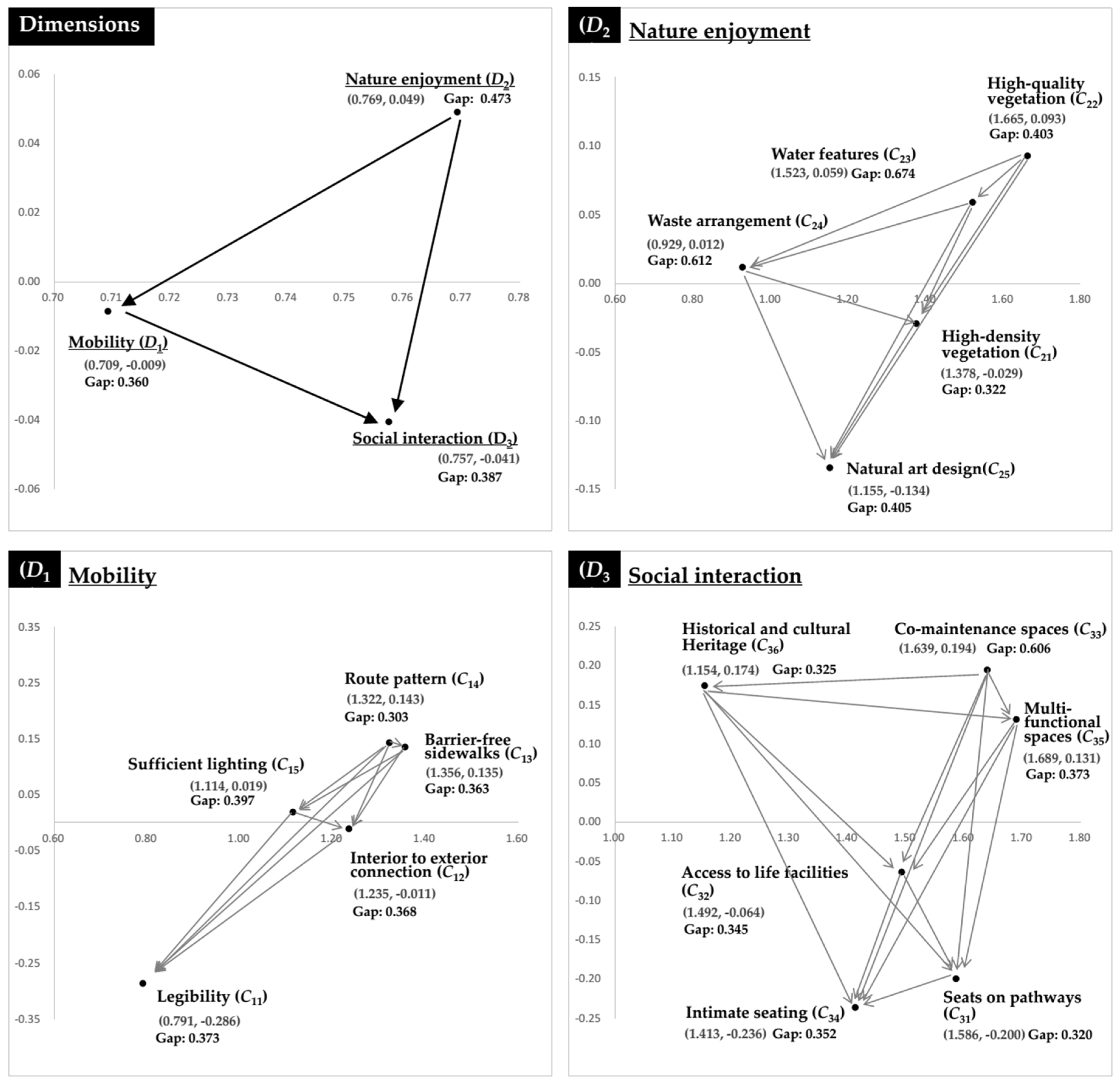 The integration values for performance and gaps are presented in Table 2. The nature enjoyment (D2) dimension exhibited the largest gap value (0.473), and among its criteria, water features (C23) exhibited the largest gap value (0.674). Therefore, the POS can proceed with priority improvement by using the criteria with the largest gap value. The following criteria exhibited large gap values: waste management (C24) (0.612), Co-maintenance spaces (C33) (0.606), natural art design (C25) (0.405), and high-quality vegetation (C22) (0.403). The following criteria exhibited relatively small gap values: route patterns (C14) (0.303), seats on pathways (C31) (0.320), and high-density vegetation (C21) (0.322); however, their absolute values were still large (to 0). Thus, this POS has serious problems, and several improvements need to be implemented to achieve a POS that realizes healthy aging goals.