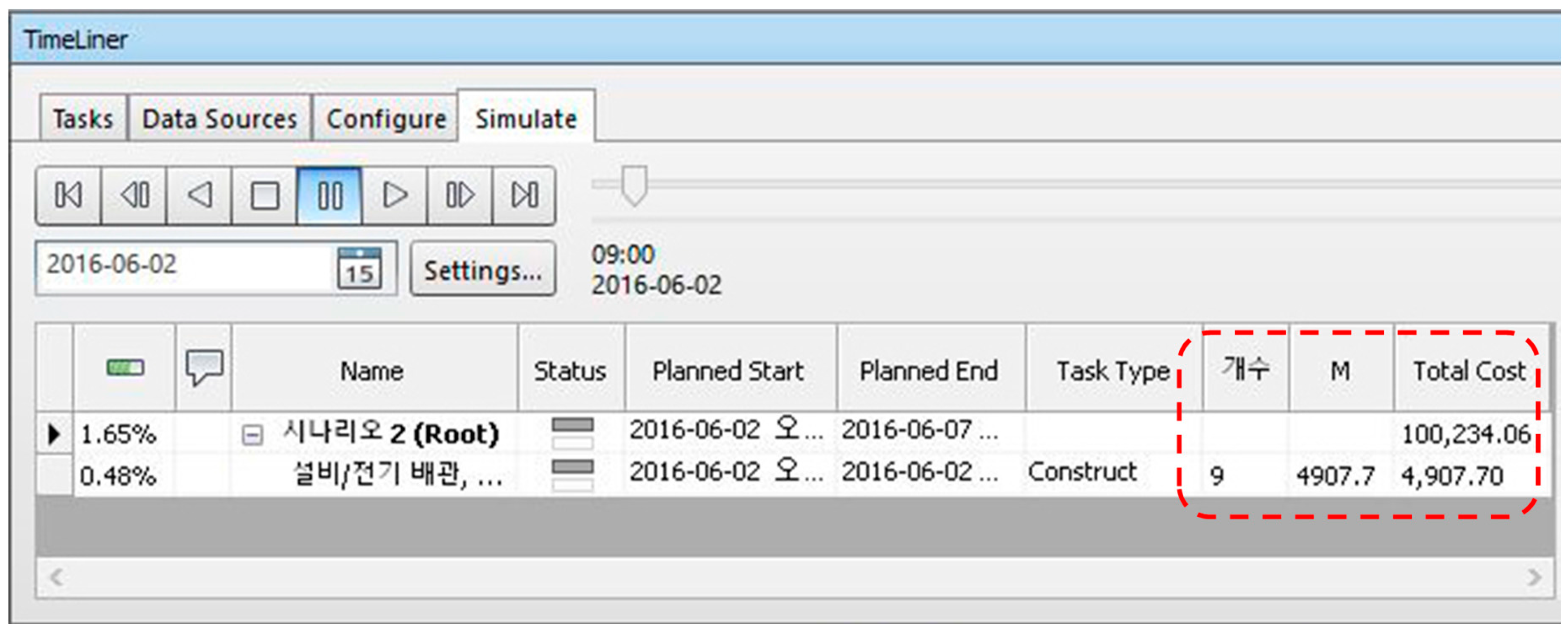 To resolve this problem, a 4D model (.nwd) with material quantity information mapped to the Timeliner can be provided to factory managers, along with a material list (.csv) collected directly from the model authoring tool the manufacturers also receive and a detailed process simulation according to the part. Factory managers can then construct a variety of cost and material plans using OL4MfM and the Timeliner, with material quantity information mapped according to individual process activities. In addition, the experienced workers responsible for each part gain an understanding of the approximate material quantities they will need, which are otherwise simulated for their processes through OL4MfS and the material quantity take-off documents provided. Resource preparation, storage, and manufacturing tasks can thus be performed without delay, reducing congestion at the work site. Figure 7 shows the CSV-format BOM, in which the module model’s material quantity information originally mapped to the process information modeled by Autodesk BDS 2016 was instead produced and arranged through the BOM function. The start date, finish date, and material quantity information were matched according to the process activity (Display_I.D).
