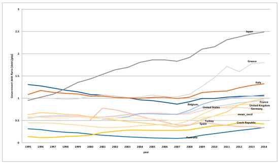 We have witnessed big increases in public debt levels across countries after the recent economic crisis. As can be seen in the following Figure 1, the public debt ratio to GDP has increased quite sharply following the global economic crisis of 2008, and this phenomenon is prevalent across advanced countries (A referee suggests that it should be acknowledged that the surge in public debt, particularly after the 2007/08 crisis, was to some great extent a consequence of the nationalization of private debt). The debt ratio has surpassed 1.0 in several countries including Japan, Greece and Italy. The persistent growth in public debt has raised serious concerns regarding fiscal sustainability and its effect on the economy. For instance, Reinhart and Rogoff [] suggested a threshold for public debt under which each country is recommended to remain below in order to prevent any risk of default.