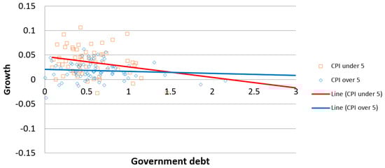 The results above are sharply contrasted to those in Jalles []. In the estimation results of Jalles [], the estimate of the interaction term between public debt and corruption turned out to be negative. This implies that corruption has a positive moderating effect on the relationship between public debt and economic growth, which contradicts the theoretical prediction. As discussed in Section 2 above, the moderating effect of corruption should be negative in any case. The results shown in Table 3 and Table 4 though conform to the theoretical implication. The interaction term between debt and the CPI was estimated to have a positive sign regardless of the models.