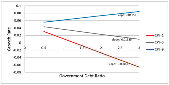 Based on the estimation results above, we can plot a figure showing the marginal effect of public debt on economic growth, which is dependent upon corruption. If we take the estimates in model (3) in the table above, the marginal effects are different across countries since each has a different level of corruption. Figure 4 shows three different cases of CPI scores: 1.0, 5.0 and 9.0. When the CPI score is 1, the marginal effect becomes −0.03863 based on the calculation: slope = −0.0449 + 0.00627 *CPI. In the meantime, the slopes are −0.01355 and 0.01153 when the CPI scores are 5 and 9, respectively.