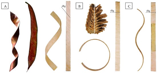 Examples of such natural responsive systems include plant species that have evolved functional mechanisms of repeated moisture-induced shape morphing enabled solely by inherent hygroscopic properties and intricate hierarchical structure of their tissues. For instance, opening of seed-producing scales of conifer cones in a dry environment (Figure 1B) actuates the dispersal of ripe seeds ensuring favourable conditions for their germination [18]. This mechanism results from the bilayered structure of the scales which consist of cells with differing orientation of stiff cellulose microfibrils (CMFs), exhibiting large transverse and small longitudinal swelling and shrinkage (hygroexpansion) [19,20,21]. The anisotropic dimensional changes of CMFs are translated into differential hygroexpansion of the scales’ layers which results in bending. The response of conifer cones is reversible and repeatable over many cycles even after the seeds are released and the tissues of the scales are biologically dead [13].