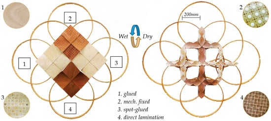The production of wood-based hygromorphic composites capable of withstanding the internal stresses and large changes in curvature resulting from differential hygroexpansion over multiple cycles of response without delamination, requires the selection of fabrication methods that simultaneously provide high strength, stiffness, flexibility and durability of the interfacial bond between the layers [34]. At the same time, negative effects of the bond on the response size and speed must be minimised. Four different methods of material fabrication have been tested, including gluing, mechanical fixing and spot-gluing of rigid passive layers and direct lamination of glass fibre- and bio-fabrics (Figure 2).