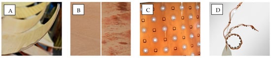 Prototypes of responsive cladding modules with different layer configurations and opposite pre-programming of panels in wet (left) and dry (right) conditions. The left and right sides of the prototypes consist of panels with standard and perforated active (A,C) and passive (B,D) layers, respectively. The configuration of thin panels (A,B) is the same as glued composites in Figure 5. Thick panels (C,D) comprise 3.2 mm thick quarter-cut English oak (Quercus robur) and 0.35 mm epoxy-glass layers.