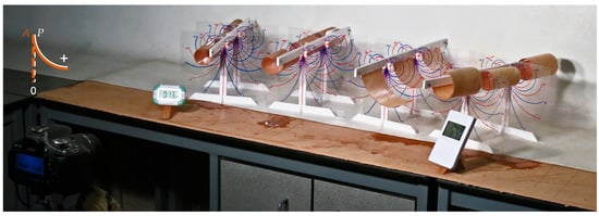 The response of the samples has been photographed with a DSLR camera at five minute intervals. Circular curvature (inverse of the curvature radius) has provided a good geometrical representation of their shape. The curvature has been determined from the photographs taken at selected time steps using transparent reference charts, placed between the samples as shown in Figure 4. This method is more laborious than automated data extraction based on digital coordinate tracking of marked sample parts, employed by Ruggeberg and Burgert [26], however, it enables simultaneous testing and direct performance comparison of multiple samples in equal conditions, which improves the consistency and validity of test results.