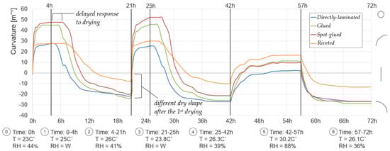 The results of the test have shown that spot-glued composites have the overall highest response speed among hygromorphs with analogous configurations and, owing to comparatively small amount of trapped water between the layers, they are noticeably quicker to dry from a wet state than hygromorphs with mechanical fixings (Figure 5). Similar to previous observations by Holstov et al. [34], all samples have responded significantly faster to wetting, where 80% of the total curvature change is achieved within the first 20–30 min depending on the composite type, than to ambient humidity changes, where the same proportion of the response takes 2–3 h. This is explained by the difference between quick initial adsorption of liquid water into wood dominated by capillary forces compared to much slower processes of molecular diffusion, evaporation and transport of water within the cell walls of the wood layer [21,33]. In addition, all composites exhibit a delayed response to drying after wet stages due to the initial evaporation of free water (stored in cell cavities) which does not influence the dimensional changes of the active layer.