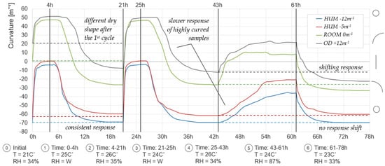 Average response of hygromorphic composite samples with different pre-programming, but identical dimensions and configurations (the same as glued composites in Figure 5). Different initial curvature and active layer pre-conditioning (where “HUM” is ~90% relative humidity (RH) at 23 °C, “ROOM” is ~35% RH at 23 °C and “OD” is oven-dried at 65 °C), have been applied for pre-programming. Same experimental setup and data collection methods have been employed as in the test described at the end of Section 2.1. Full results of this test are provided in Supplementary Data File S2.