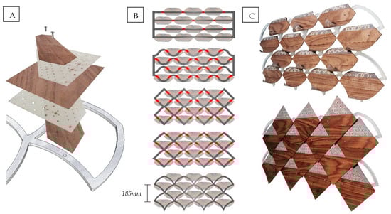 The operational functionality of the responsive facades can be controlled both on material level and through design of cladding configurations and supporting understructure. Beyond aesthetic design considerations, the choice of cladding overlay pattern can influence the rate and degree of porosity changes [39] and enable additional functions, such as to prevent permeation of rainwater through the hygromorphic skin. The latter requires the clad surface to be inclined to set the direction of water flow and the cladding elements to be ordered and overlaid in such a manner that each panel overlaps the one below it, similar to wall shingles or roof tiling. Figure 7 shows two examples of possible cladding designs where the arrangement of overlapping composite panels, inspired by lizard skin (“A” and “B”) and rectangular roof tiles (“C” and “D”), provides full surface coverage in pre-determined ambient conditions. Both of these designs are based on repeated patterns of identically sized panels facilitating simplified production.