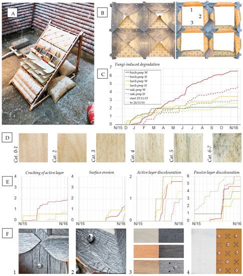 (A) Outdoor testing prototype incorporating hygromorphic panels and samples with different material configurations and pre-programming; (B) responsive cladding module with improved arrangement of panels in wet/closed and dry/open state after 12 months in full weathering conditions; (C) time plot of fungi-induced degradation, where “prep D” and “prep W” are composites pre-programmed to assume flat shape in dry and wet conditions, respectively; (D) illustration of the fungi-induced degradation categories from (C); (E) time plot of other effects of degradation, including (from left to right) average sample cracking, mechanical decomposition and active and passive layer colour changes (use the key from (C)); and (F) illustration of the material degradation effects from (E) in the same order. Full test results and description of the assessment categories for the degradation effects plotted in (C,E) are given in Supplementary Data File S4.