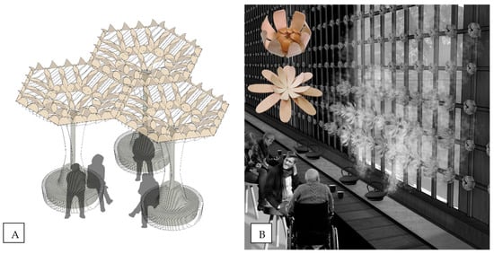 (A) Design concept of modular outdoor seating with a responsive canopy roof and an integrated drainage and rainwater collection system; and (B) artistic render of a teahouse with interior wall cladding comprised of responsive elements designed to imitate opening and closing of tea-flowers.