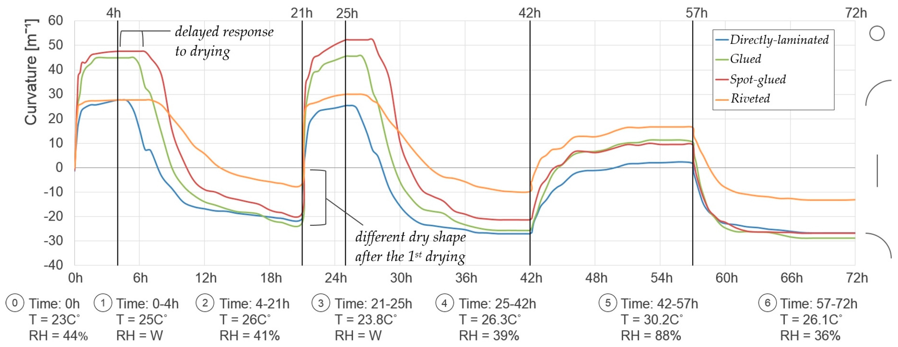 Figure 6). There is also a noticeable, albeit less pronounced, tendency for the response of these composites to shift towards a lower or more negative curvature with each consecutive response cycle. Conversely, it has been observed that hygromorphs with comparatively thick dry-bonded active layers (above ~5 mm) gradually obtain positive dry curvature after the first few wetting and drying cycles. This points to the possibility of selecting a “balanced” intermediate active layer thickness enabling a consistent cyclic response of dry-bonded hygromorphs. This principle has been employed when configuring the responsive panels, used for prototype “D” in