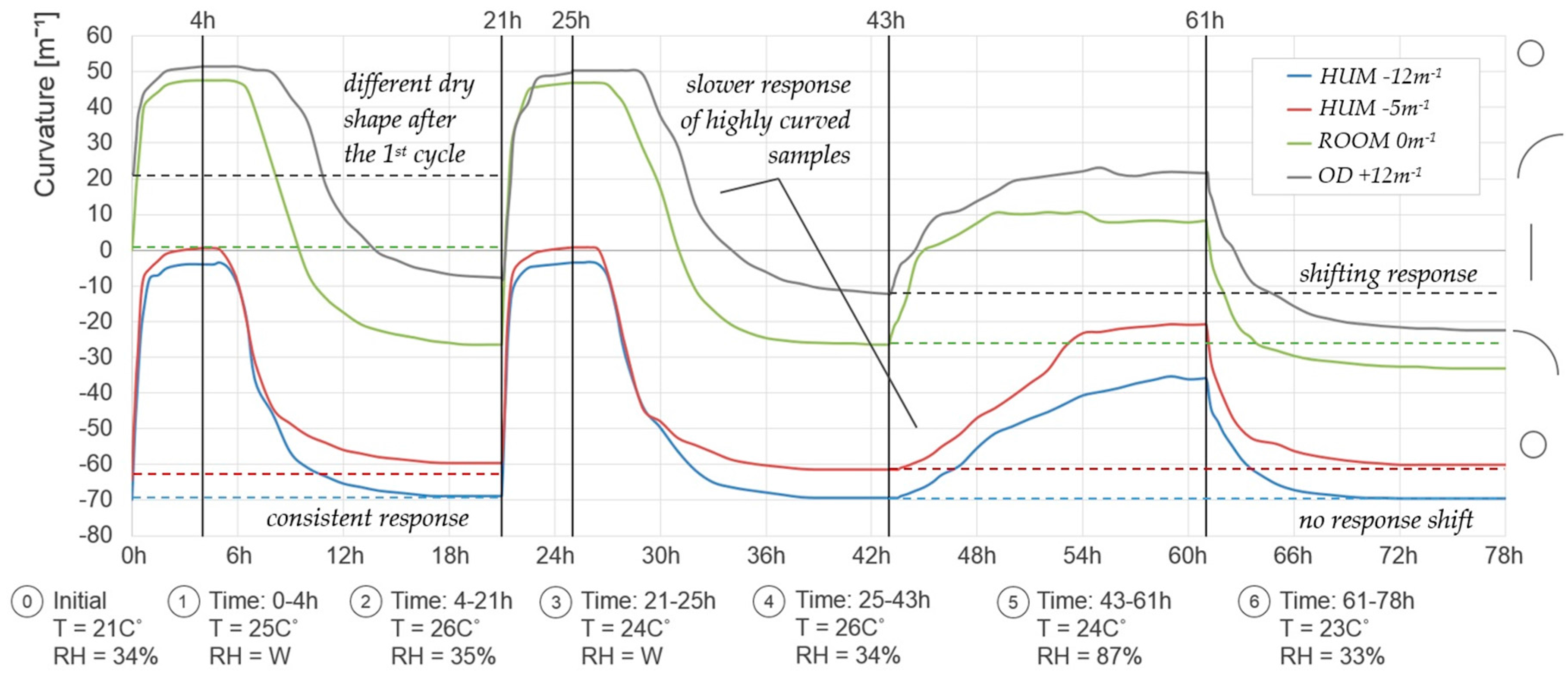 The effects of the discussed material fabrication techniques on the responsiveness (magnitude of curvature changes) and reactivity (rate of curvature changes) of the resulting composites have been investigated in a lab test with controlled cyclic changes of ambient moisture conditions. Three samples of each of the four types of composites, listed in