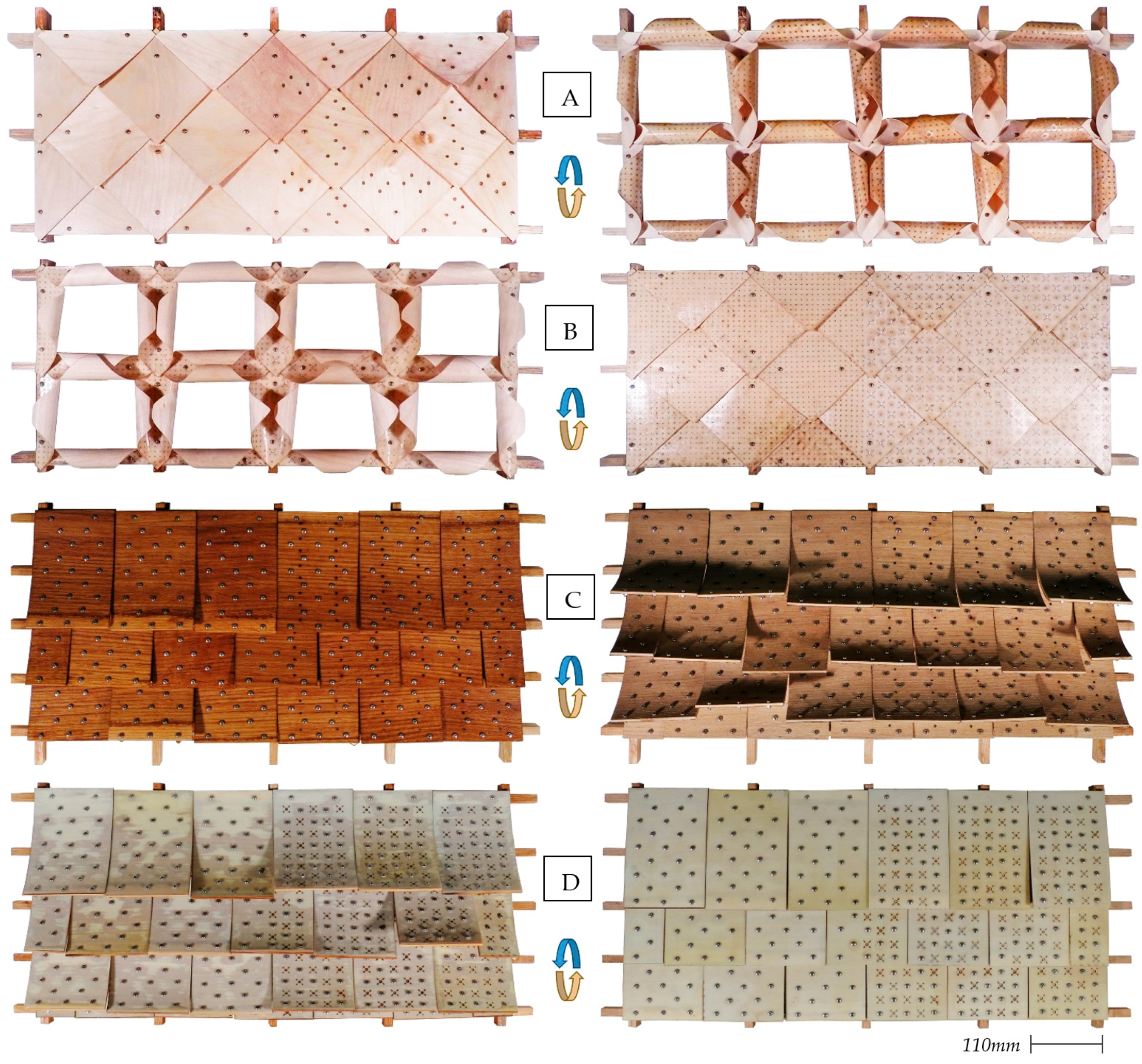 In addition to testing of the developed cladding patterns and the ability to pre-program the response direction of hygromorphs, the prototypes have been used to further explore the effects of layer perforation on the response speed. The right side of each of the illustrated cladding modules contains panels with perforated top layers. In agreement with the test results summarized in