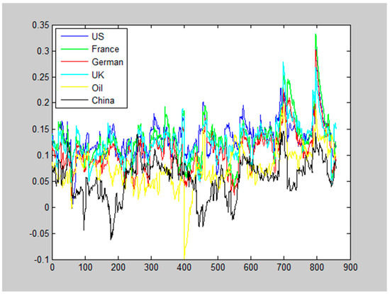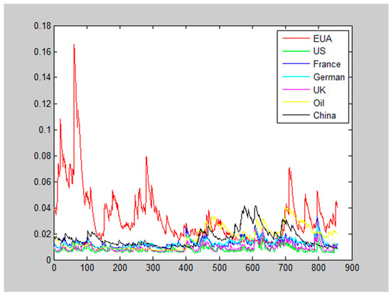 The seven series’ dynamic variances (as represented by standard deviation here (since the magnitude of the variances is relatively small, we can determine the variation details when they are presented in the original format. Thus, we present the standard deviation here as a substitutive indicator of series volatility) are simulated with the GARCH method, as represented in Figure 1. Obviously, the EUA return is much more volatile compared to other traditional financial products. This is especially true during the first half period of our observation. The oil price is also subject to large uncertainty. In contrast, the performance of traditional stock markets is quite stable, especially those operated in the developed world.