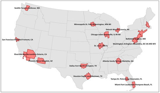 Suburbs refer to areas not located in the core cities or cities of each MSA. Several studies have identified, defined, and measured urban, suburban, and rural areas. While population and/or housing density is the most common tool [65,66,67,68], there is some research which reflects the influence of socioeconomic aspects on defining spatial patterns [69,70]. This study utilized only the core city concept, not that of principal cities suggested by the U.S. Census Bureau, since our major interest lay in ‘old suburbs’, the first generation of suburban developments. A core city would be the historically dominant and largest municipality in the metro area, while principal cities in 2010 might have been exurbs or fringes of core cities in the 1950s when the first suburban developments appeared. To identify core cities, the names of MSAs and principal cities in 2010, as well as standard metropolitan areas (SMAs) and core cities in 1950, were matched (see Appendix Table A2). Core or principal cities that overlapped in 1950s SMAs and 2010 MSAs were selected as core cities in this study. One census tract corresponded to one neighborhood as often found in the previous empirical studies [71]. If the boundaries of the census tracts and municipalities did not exactly match—for instance, if a census tract extended between urban and suburban areas—any census tract that overlapped with a suburban area by 50% or more was classified as a suburb [72]. Neighborhoods built between 1950 and 1970, when the suburban developments started and had rapidly expanded, now require significant remodeling and revitalization efforts.