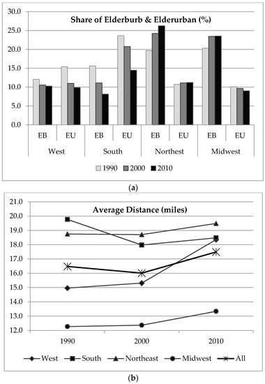 Second, the growth of EBs was substantial in the Northeast and Midwest. As expected, suburbs in the Frostbelt are aging while the Sunbelt is becoming younger thanks to remodeling and renovation efforts in the built environment. According to Frey [60,76], the low values of aging indicators for Sunbelt areas were rooted in the rapid growth of a younger population. A combination of immigration, domestic migration, and the natural increase of the younger population correlates with the relatively low-share of older residents in these areas. On the other hand, both the out-migration of young adults and the aging-in place of older residents may significantly affect the growth of EBs in the Northeast and Midwest. Thus, although increases in the absolute number of older people in metro areas have become quite common throughout the nation, the differences in shares of the younger population, specifically the under-45 population, may reveal different patterns of EBs and EUs based on census regions.