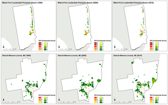 The transition of the social vulnerability index (SVI) between 1990 and 2010 in the Miami-Fort Lauderdale-Pompano Beach, FL Metropolitan Area (Top, the Highest Average SVI Score) and the Detroit-Warren-Livonia, MI Metropolitan Area (Bottom, the Largest Gap between EUs and EBs).