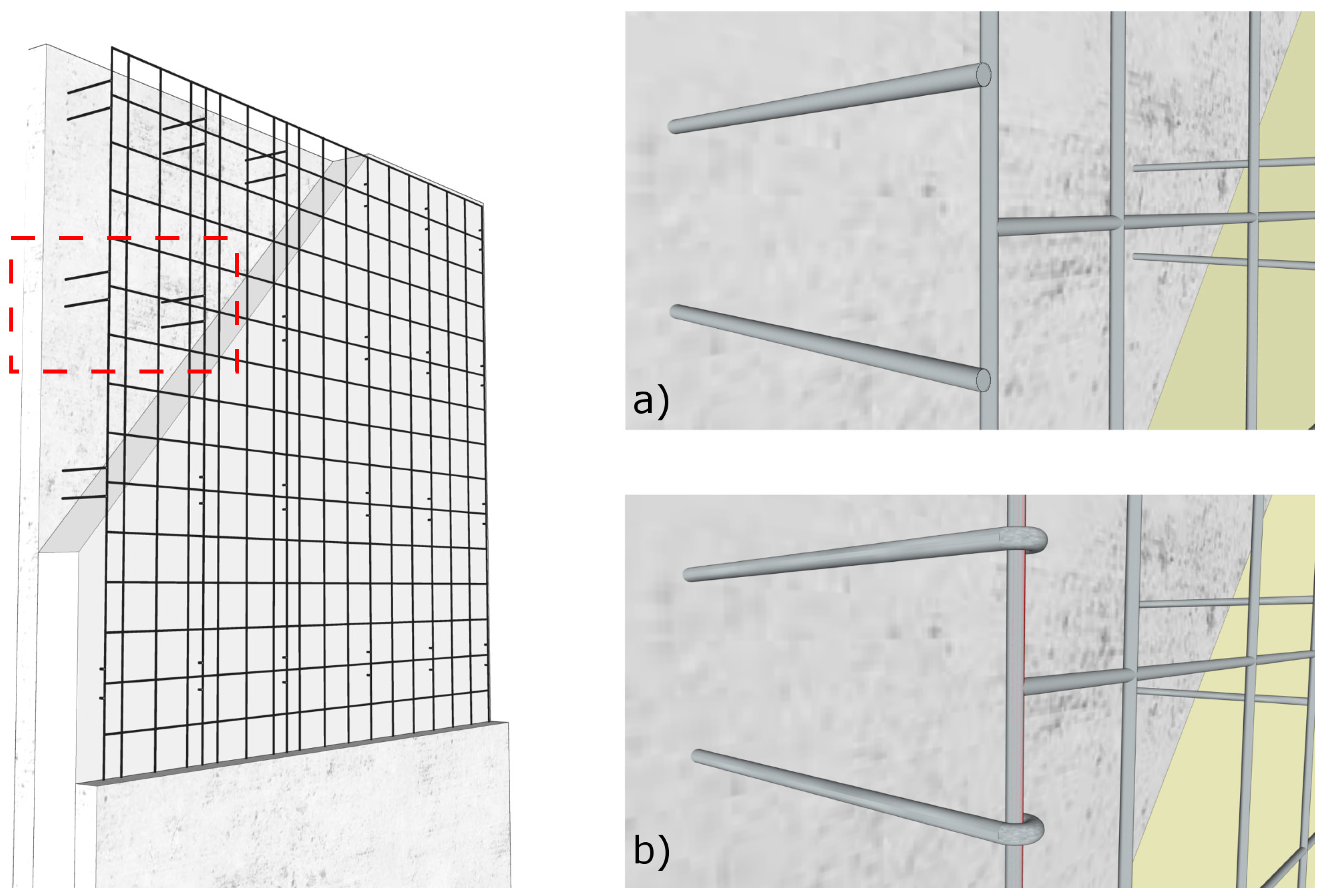 There are two main methods to produce RC sandwich panels depending on the cast of concrete, cast-in-situ concrete and precast concrete. Actually, connectors are welded to steel wire, and it is not possible to produce sandwich panels in situ totally, butonly the concrete layers can be produced in situ. This limits their diffusion i.e., in developing countries because the welding of connectors requires a high level of automation. In addition, a high amount of energy is required as stated by the Environmental Product Declaration (EPD) [3,4]. In detail, 530 MJ are needed to produce 1 ton of RC sandwich panels, and 511 MJ are composed of non-renewable (fossil) energy. Eighteen percent (about 95 MJ) of this energy is required for the assembly stage [3,4]. Another limiting factor is the need of specialized labor for welded connectors, while i.e., developing countries can count on much not-specialized labor.