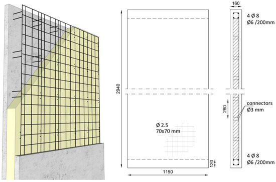 The thickness of each concrete layer was 40 mm and insulation material (Expanded polystyrene—EPS) between the concrete had an average thickness equal to 80 mm and a density of about 15 kg/m3. Two types of connectors were tested: welded connectors and bent connectors. Two RC beams were built at the base and at the top of each panel in order to avoid concentration of the load and to facilitate handling operations (Figure 2).