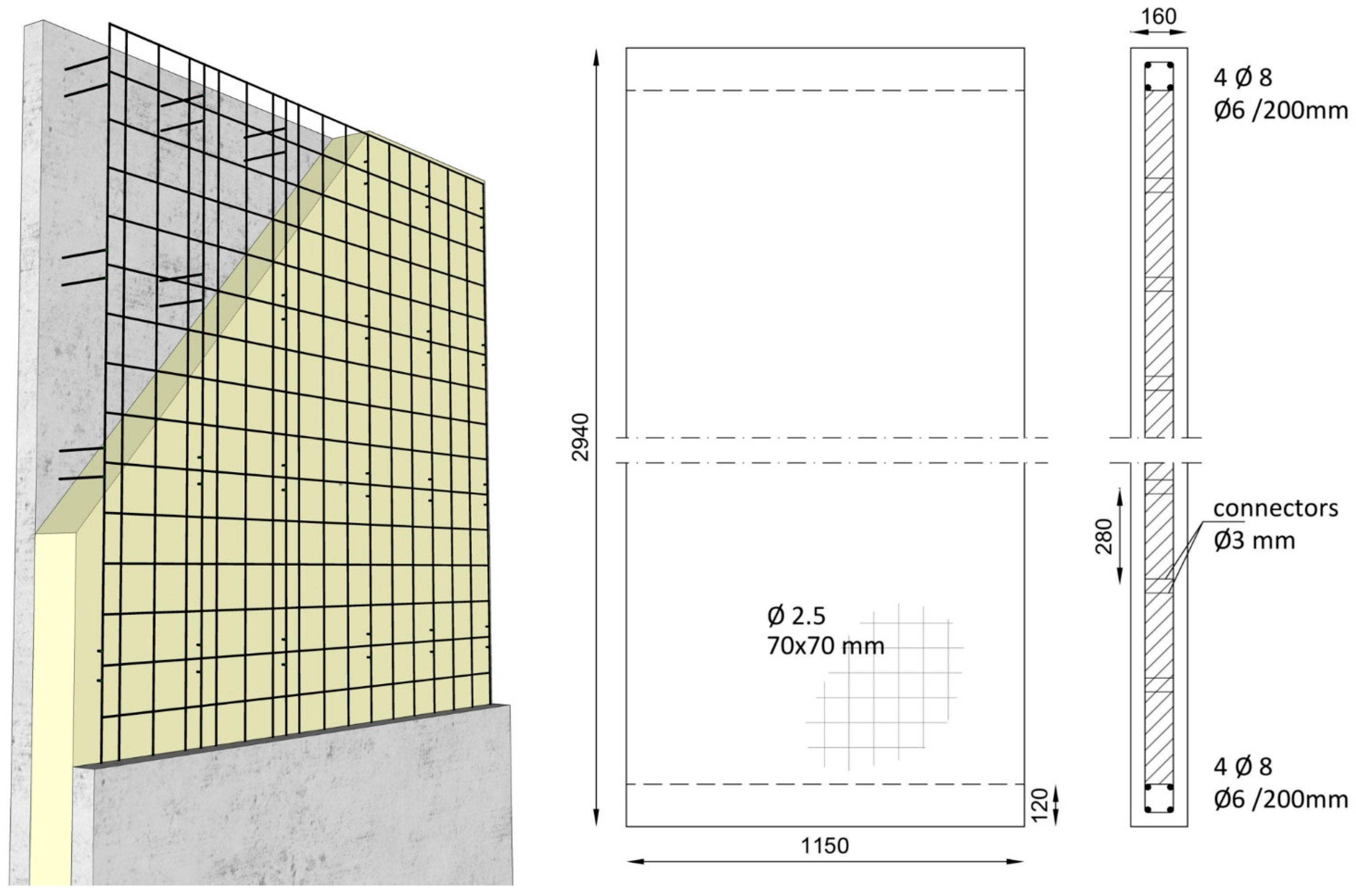 Axonometric view and technical drawings of the tested reinforced concrete sandwich panels.