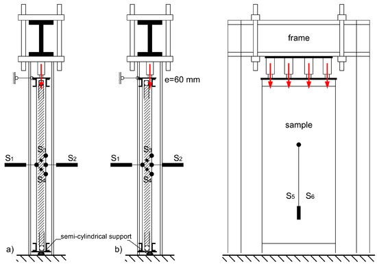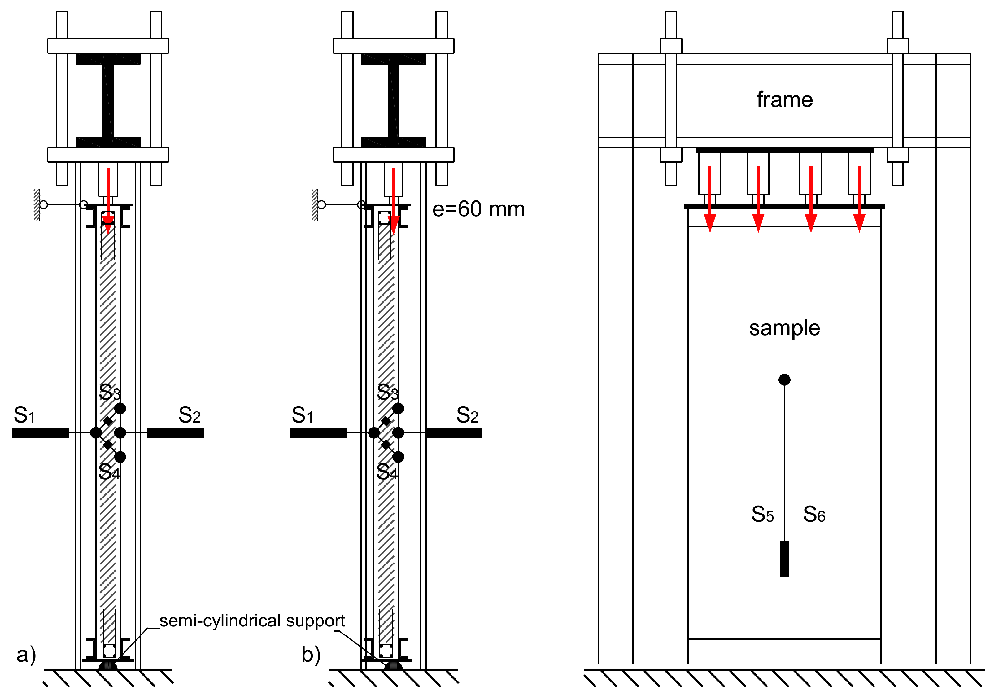 Test apparatus for axial compression test (a) and eccentric compression test (b).