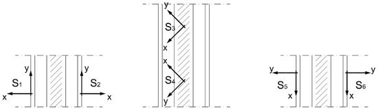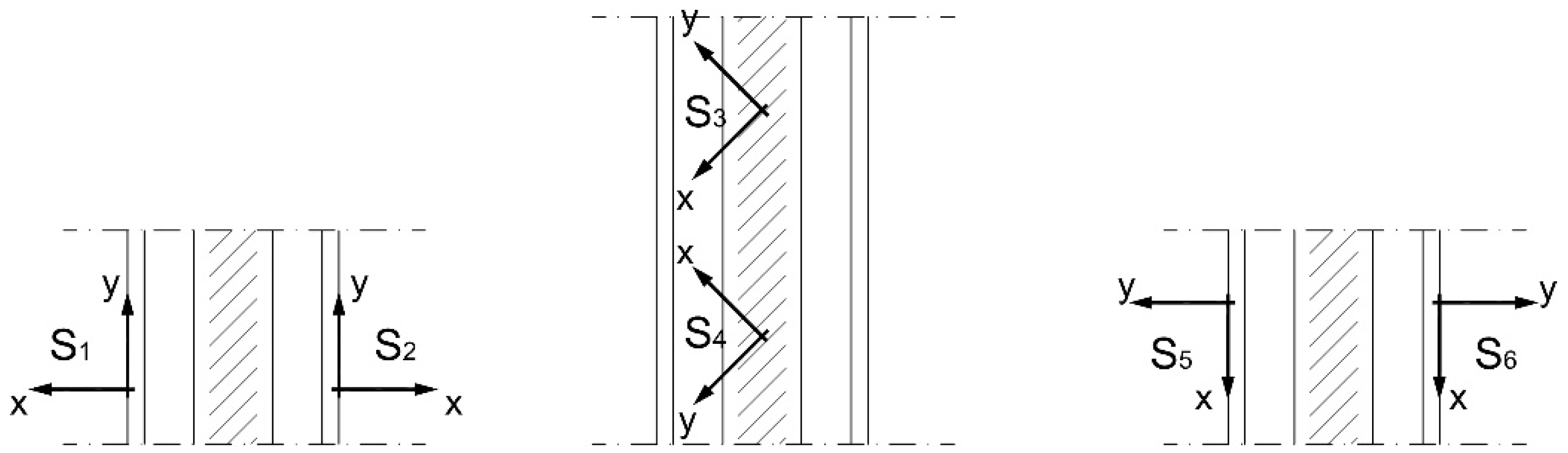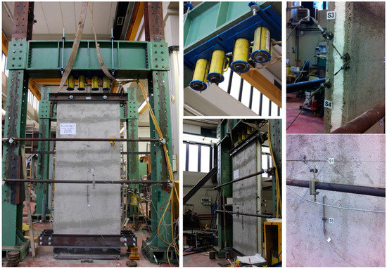 Lateral deflection (Δh) was measured by means of two transducers (S1 and S2 in Figure 3) placed at half of the height of the panel. Two other transducers (S5 and S6 in Figure 3) were placed vertically on each side to measure vertical displacement (Δv). In addition, two 45° inclined transducers (S3 and S4 in Figure 3) were placed across the thickness of each panel at half of its height to measure the longitudinal (slip Δs) and transversal (separation Δc) components of the relative displacement between the two concrete layers. All transducers from S1 to S6 had a sensibility of ±1 × 10−3 mm, and they worked in a range of ±50 mm. Values of Δs were calculated by averaging the longitudinal component of displacement measured by transducers S3−S4 and the difference between data collected by S5 and S6 (Equation (1)):