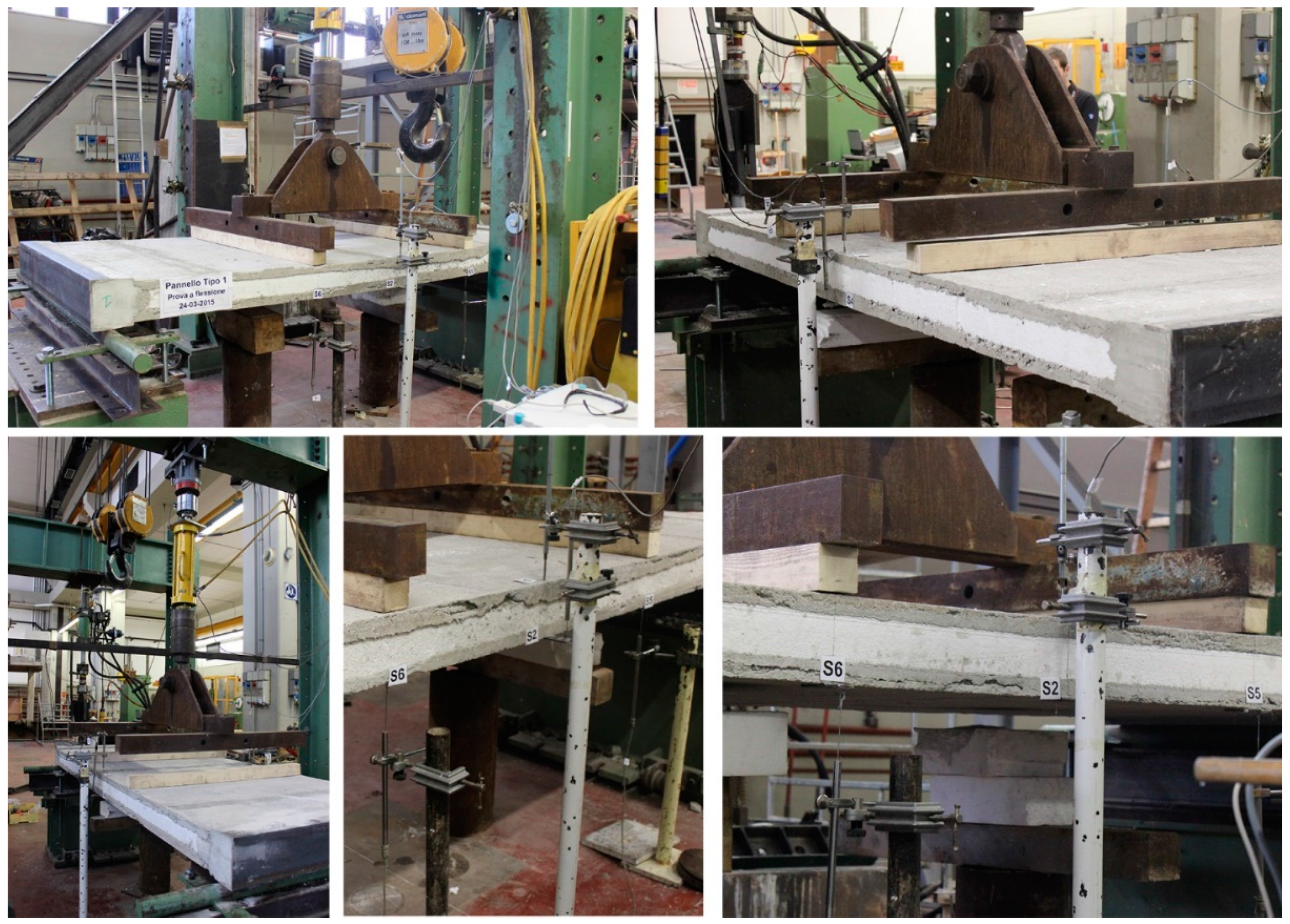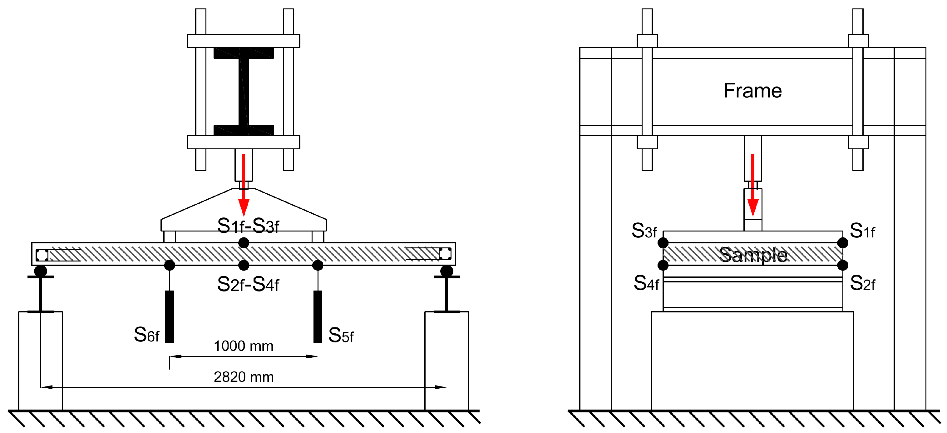 The panels were placed horizontally on two steel cylindrical supports (span equal to 2820 mm) placed on the middle axis of the RC beams at the ends of the panels (Figure 6). Load was transferred to samples by means of a spreader beam fixed to a reaction frame with a spacing of 1000 mm (Figure 6). Samples were instrumented with six transducers: S1f and S2f placed in the middle of the RC sandwich panels on the front face, S3f and S4f placed in the same position on the back face of the panels, and S5f and S6f positioned in correspondence of the load application points.
