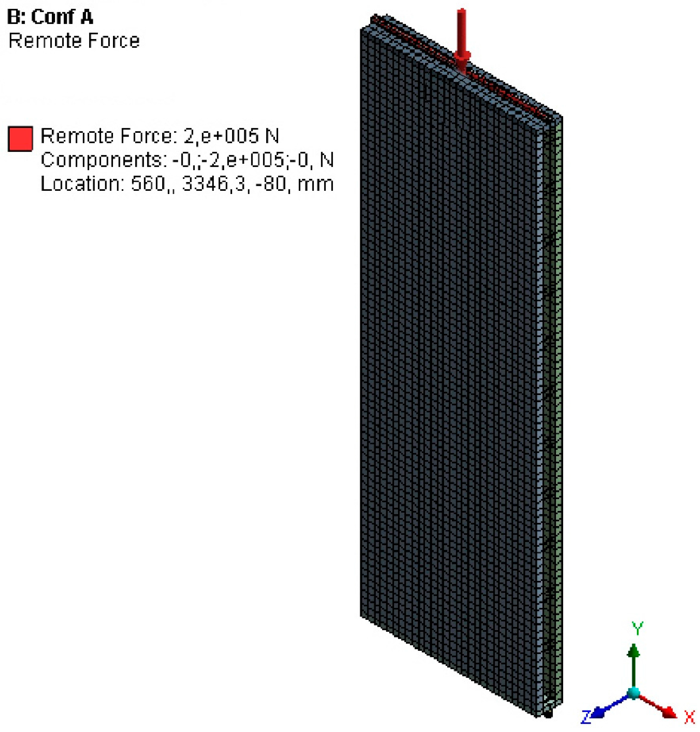 Mechanical properties of the materials were resumed in Table 3. The model was restrained with a cylindrical pin at the base and a horizontal support at the top. Two rigid elements were inserted at the top and at the base of the panel and connected (with “no separation” parameter) to the faces of the sandwich panel (Figure 8). This allows for better simulating the effect of the reaction frame on the concrete layers, especially on the nodes close to the contact point. The load was applied to the rigid element at the top of the panel in the axis of the panel (axial load) and in the axis of an RC face (eccentric load).