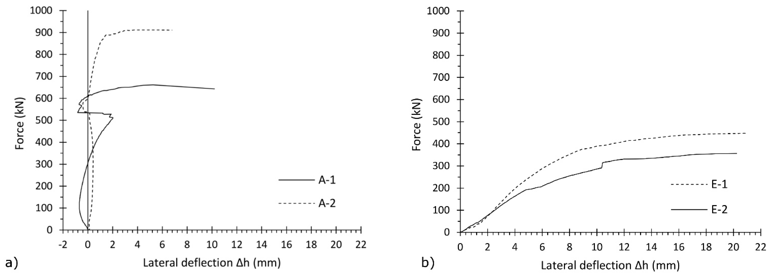 Lateral deflection Δh of panels tested under axial compression (a) and eccentric compression (b).
