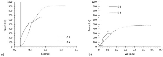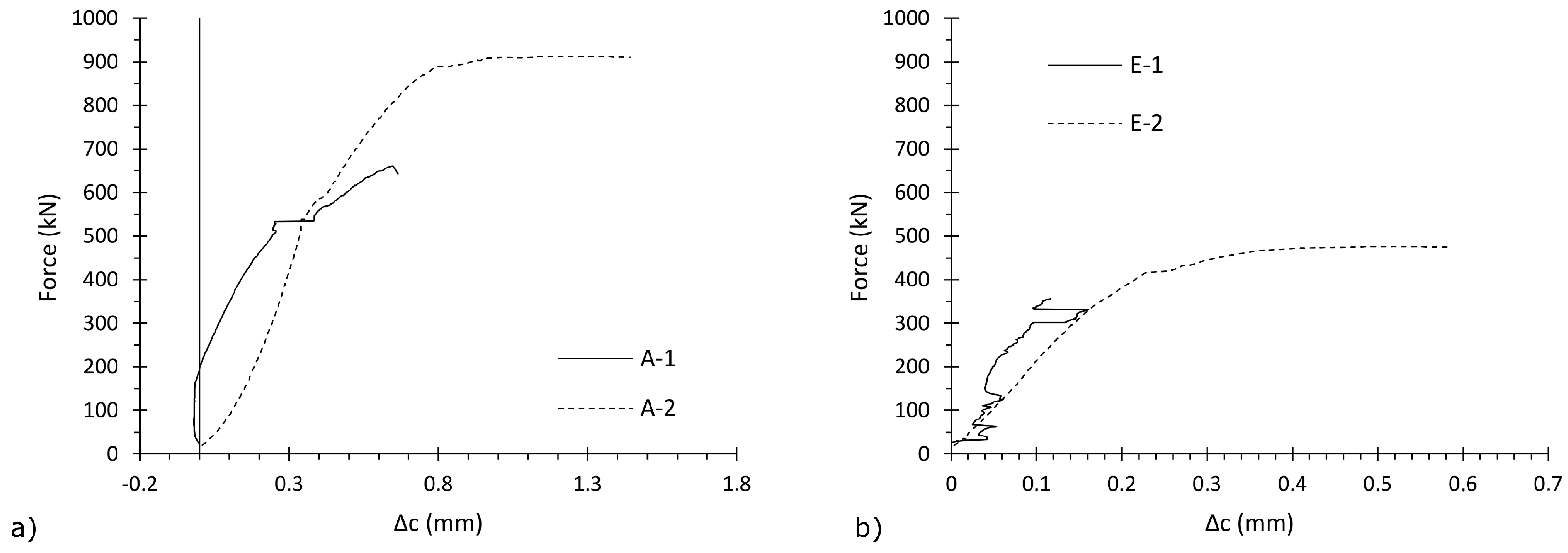 In all cases of eccentric loading (Figure 10b), Δc was close to zero up to the plastic phase.